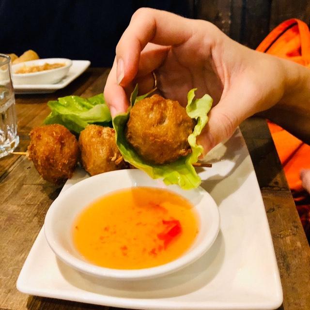 Starter – NEM NƯỚNG (Homemade pork & lemongrass meatballs with lettuce & herbs to wrap & dip)