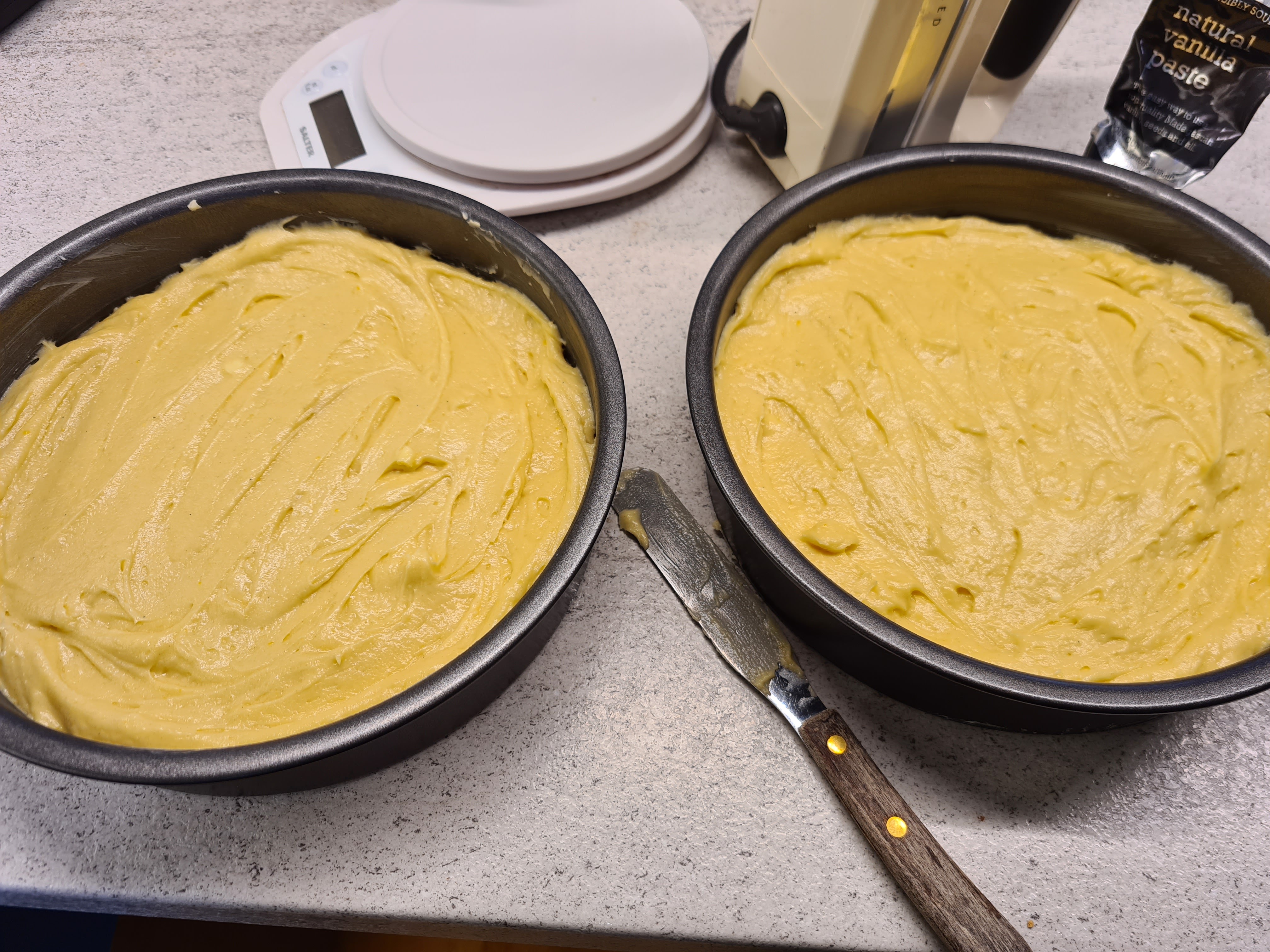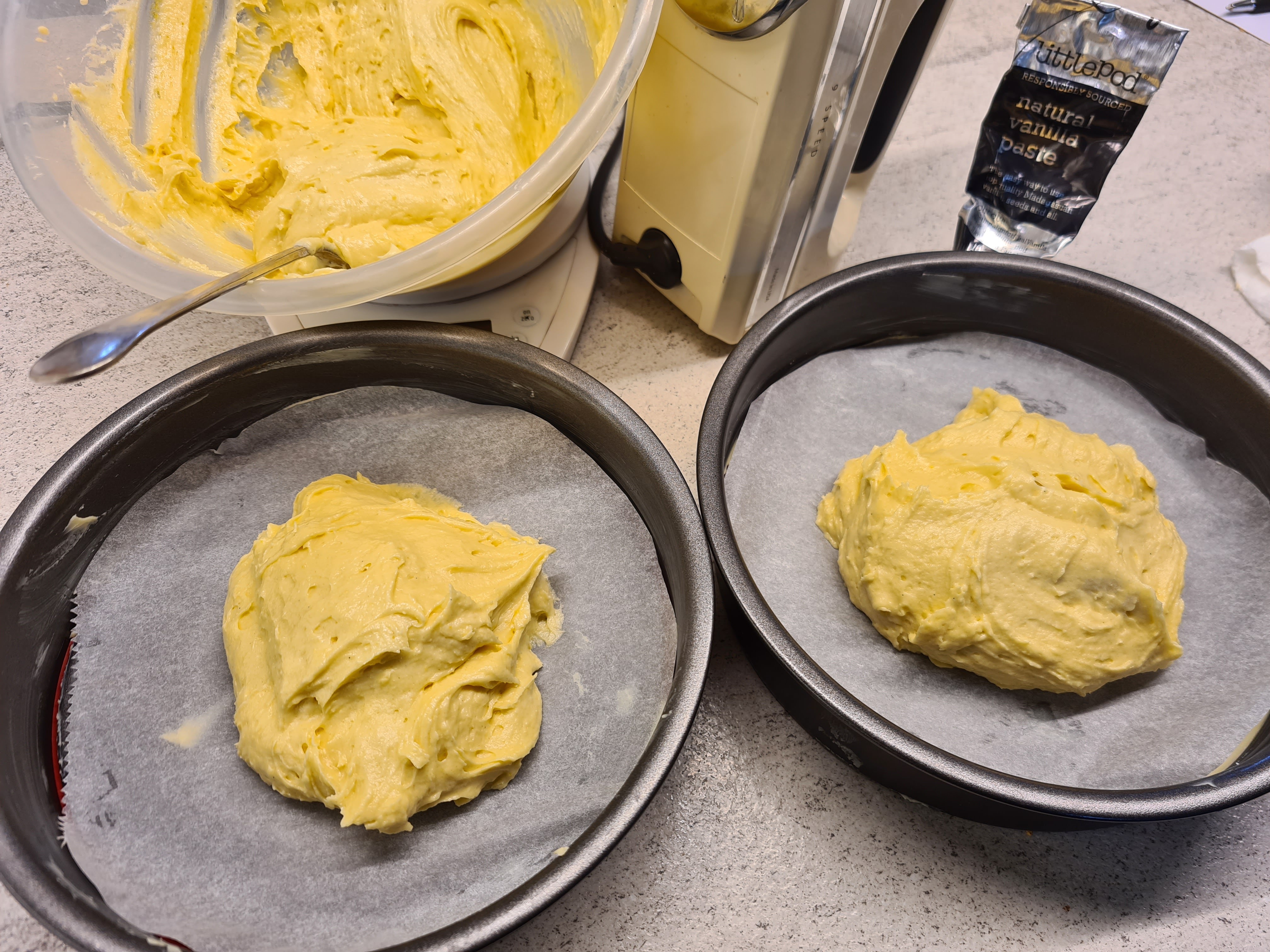 - Line the base with baking paper and grease the sides of two round baking tins 20cm diameter. Put your oven on at 180C/160C Fan.