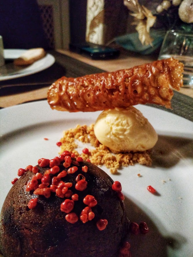 Our meal this evening included a dessert as well. I am not always the first to have dessert, but after these I am glad I did. Because it’s Christmas, I had to go for the Christmas pudding. It had little popping candy on the top and was served with a silky clotted cream ice cream, with gingerbread crumb. I had great joy loading up the spoon with cream, crumb and pudding in different sequences; each mouthful was slightly different, yet equally as flavoursome.