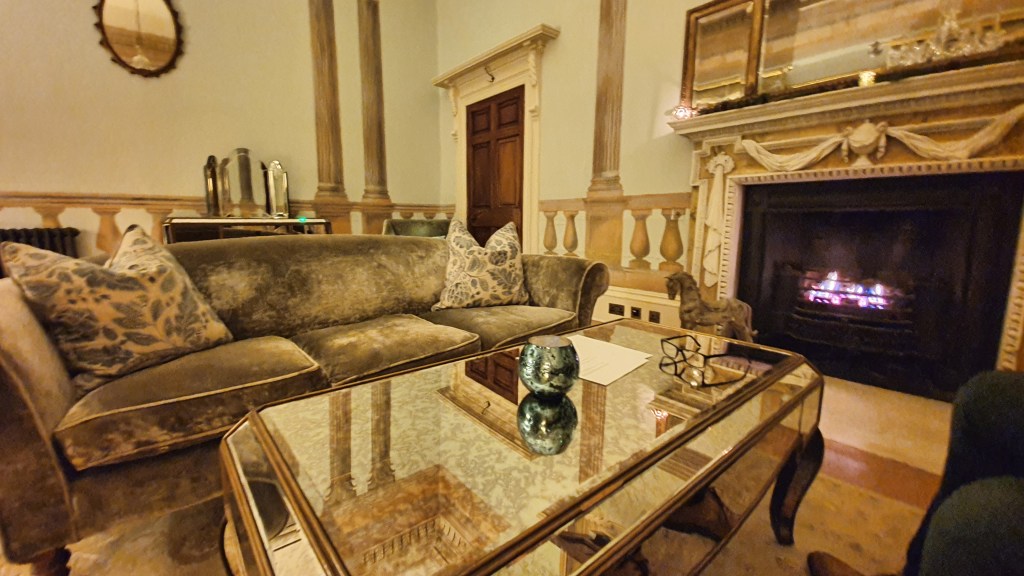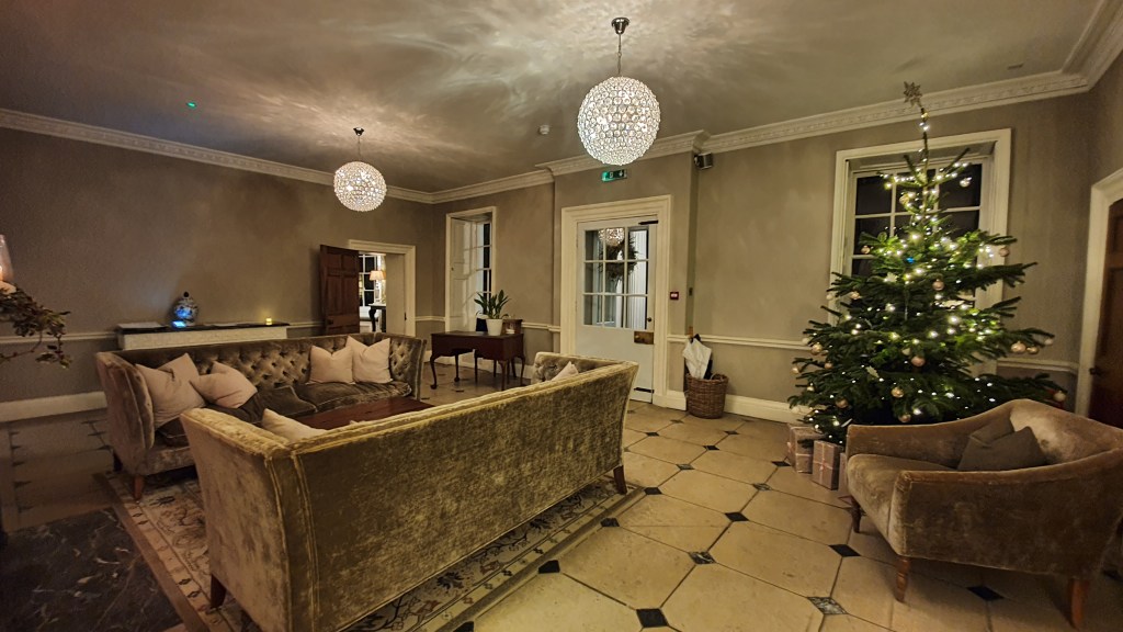 At the end of the meandering long drive a manor of this proportion deserves, we followed the lit pathway towards the glow that was emanating from this majestic building, and were welcomed into her warm bosom, greeted by the face masks we’re now all accustomed to, sadly hiding many a hospitality smile but thankfully with smiling eyes. A roaring fire, velvet sofas and gorgeous Christmas tree filled the beautiful entrance.