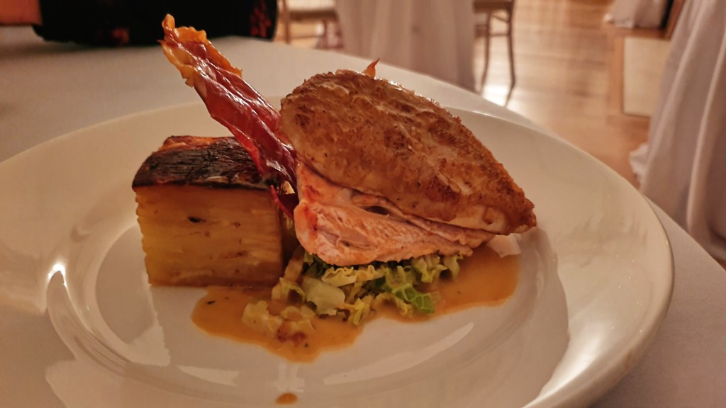- Creedy Carver chicken supreme, gratin potatoes, parma ham crisp, savoy cabbage and tarragon veloute