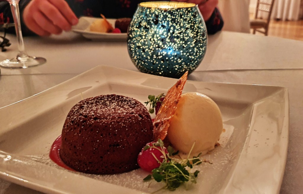 - Warm chocolate fondant, hazelnut praline, raspberries and clotted cream ice cream – we both had one!