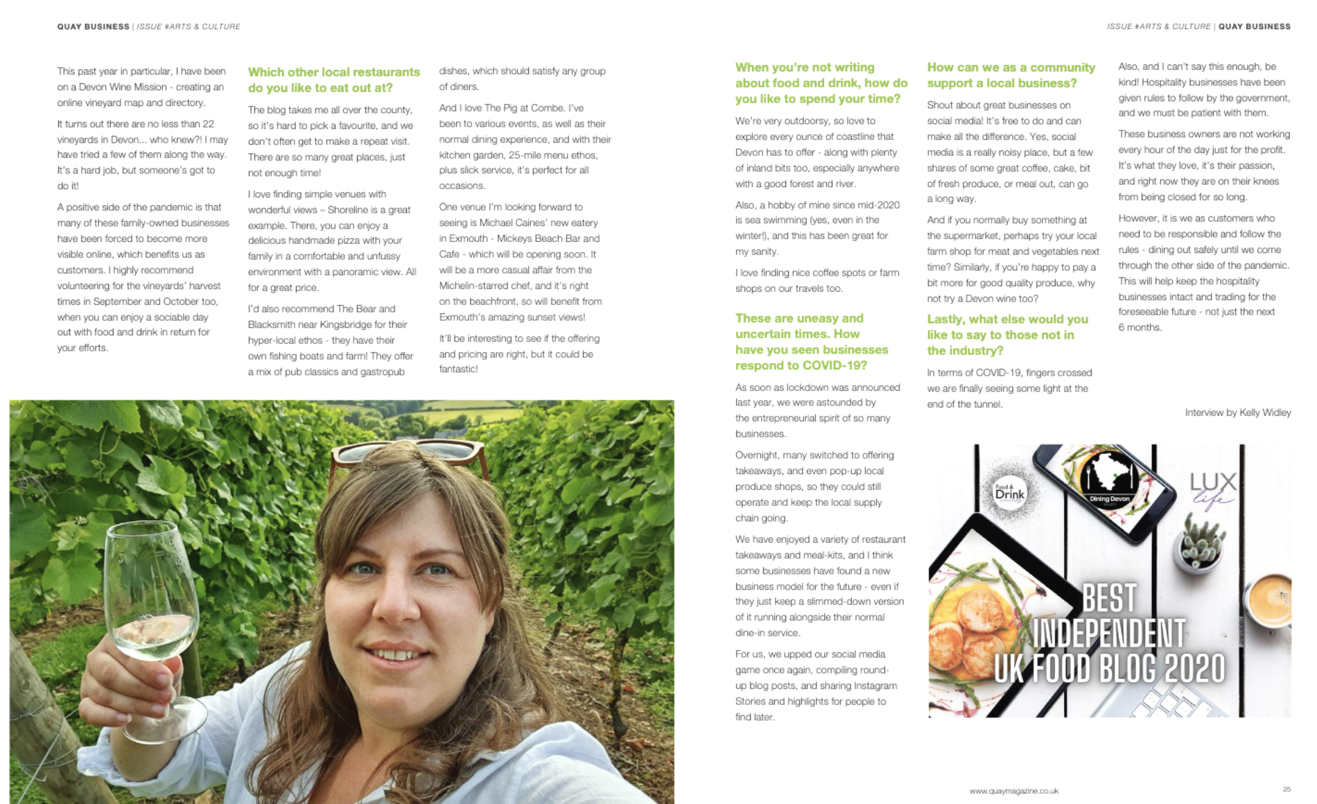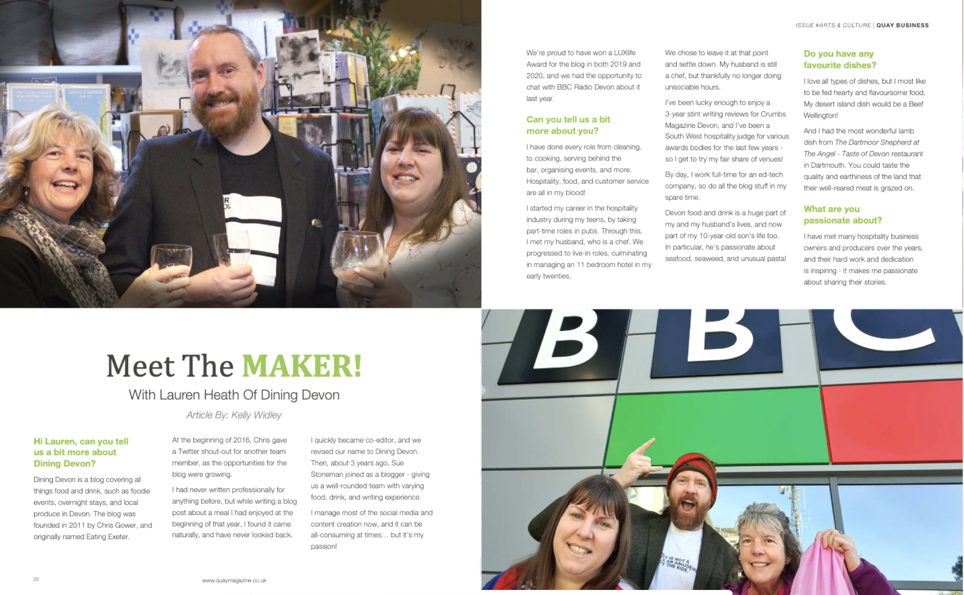 Lauren was recently interview for Torbay-based Quay Magazine’s ‘Meet the Maker’ feature, talking about Dining Devon, how hospitality businesses have done amazing things during lockdown, some suggestions of where to eat and more! You can be read it online on page 22 here.