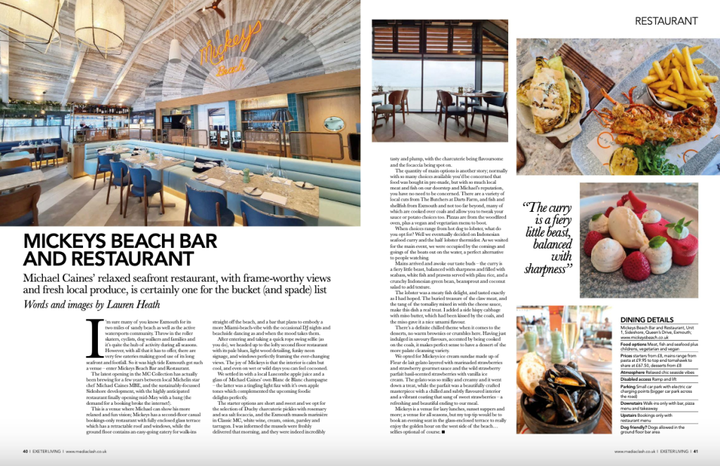 Lauren visited Mickeys Beach Bar and Restaurant recently for Exeter Living Magazine and the write up is in their latest issue! You can read it in print if you grab a copy or in their online magazine here.
