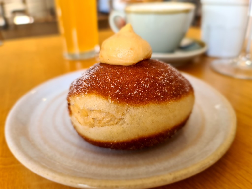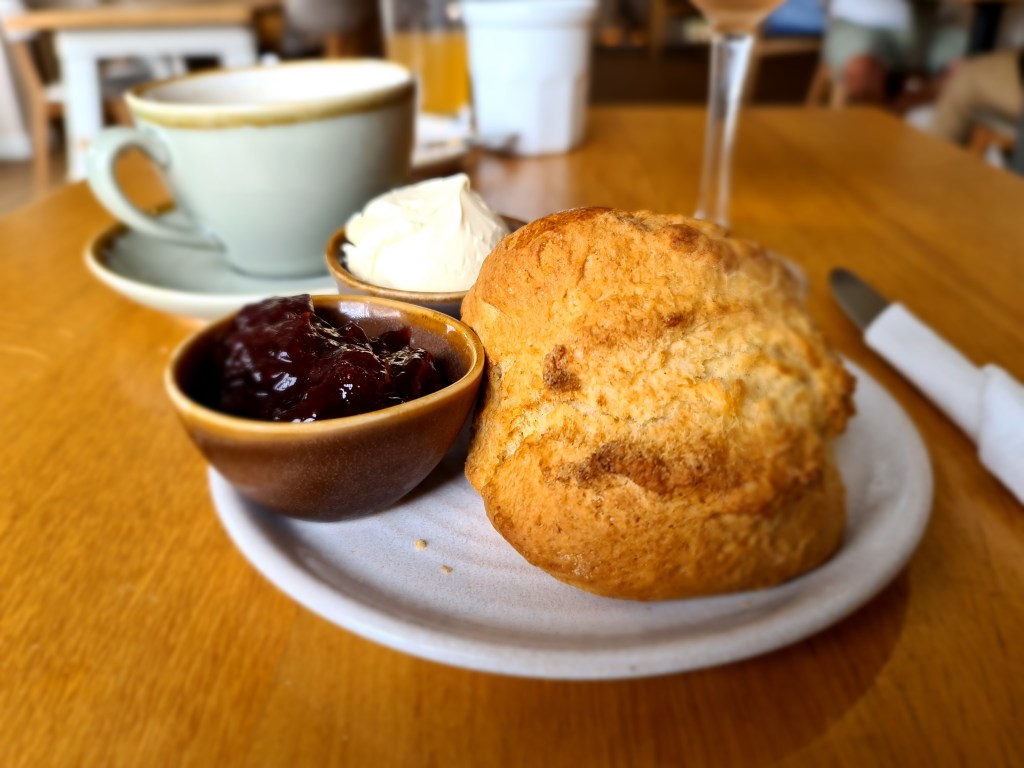 She treated herself and her son to a peanut butter creme doughnut, and a cream tea plus a glass of their own rosé – it was one of the best doughnuts and scones they’ve ever tasted. The rosé was excellent and they found out they even make their own gin. They kept eyeing up the mains as they went out and they look very good too and if you’re vegan, there are some equally delicious cakes in the cabinet.