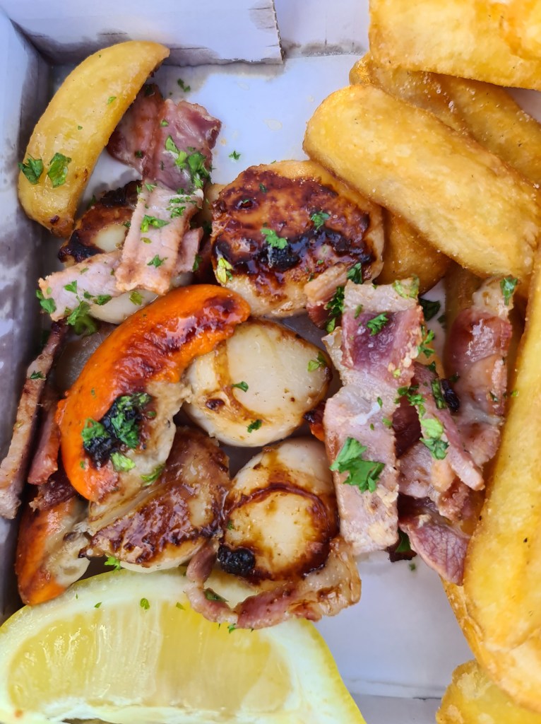 A mid week birthday, and with plans falling through, Lauren headed to nearby Darts Farm so a nice simple fish and chip supper. With the sun setting above their play field, and a glass of pebblebed rose in hand from the shack, she and her family enjoyed battered cod, grilled plaice, grilled scallops and bacon, plus some Thai fishcakes for good measure! It was absolutely delicious all round, the grilled fish is restaurant quality so it’s a really satisfying high quality yet simply pleasing takeaway.