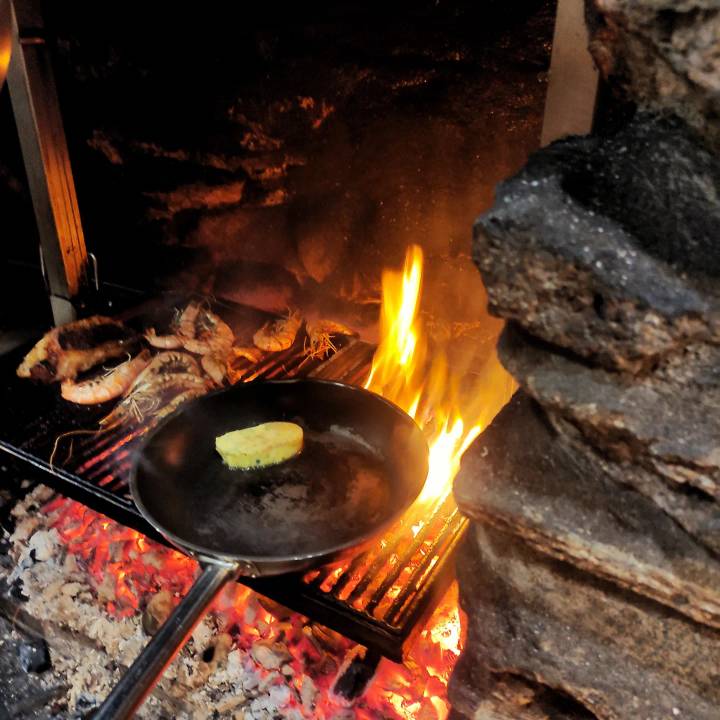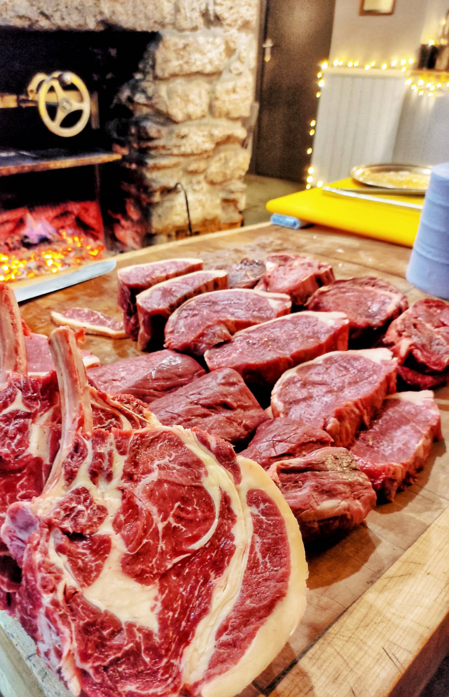 As we tentatively opened the door, the smells and warmth oozed out. After announcing our presence, we met Frank who is Head Chef and Manager. Behind him, laid out a wonderful sight – a vast platter of meat resting at room temperature, steaks of all different sizes, deep reds and incredible marbling. Within the chimney place was The Ox Grill, and it was here, right in front of us diners in the dining area, no less, that our steaks were to be cooked.