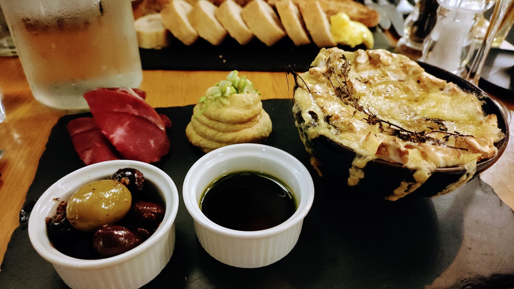 We kicked off the evening with a Baked Brie – not always a common baked cheese, from my experience baking a brie can be tricky as it doesn’t always hold its shape. Thankfully we had a little shallow bowl to hold the gooey cheesy contents, breaking through the rind like prospectors hunting for cheese gold is almost as satisfying as cracking and egg or shattering the glass topping of a Crème brûlée. Served with olives and sourdough bread and toast for dipping, this was good strong start. It’s easy for baked cheese to curdle or not goo quite enough, and the balance was well achieved and perfectly executed.