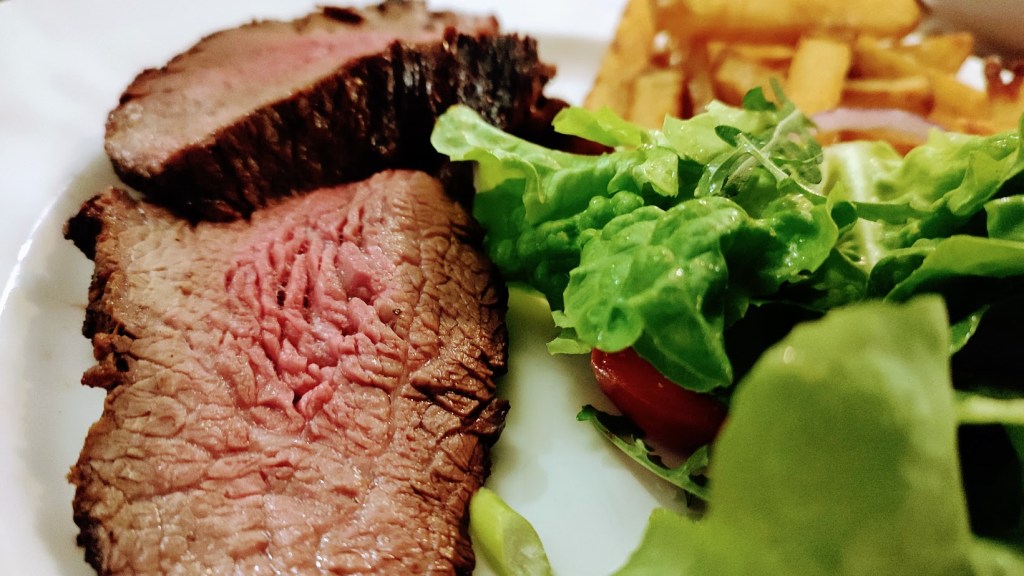 The main course was a Chateaubriand, a super tender cut taken from the a centre cut fillet. Chef recommended that we go for this option, so it was only polite to take the advice, and I am glad we did. Roasted on The Ox Grill, the transition between starter and main was swift – with chips following behind and a flavourful market garden salad.