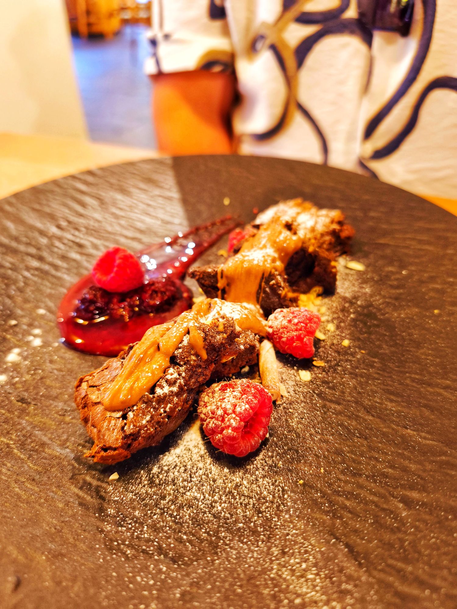 Triple chocolate brownie bites tossed in warm chocolate sauce £6.5 GF