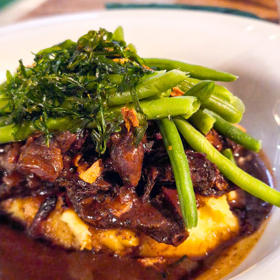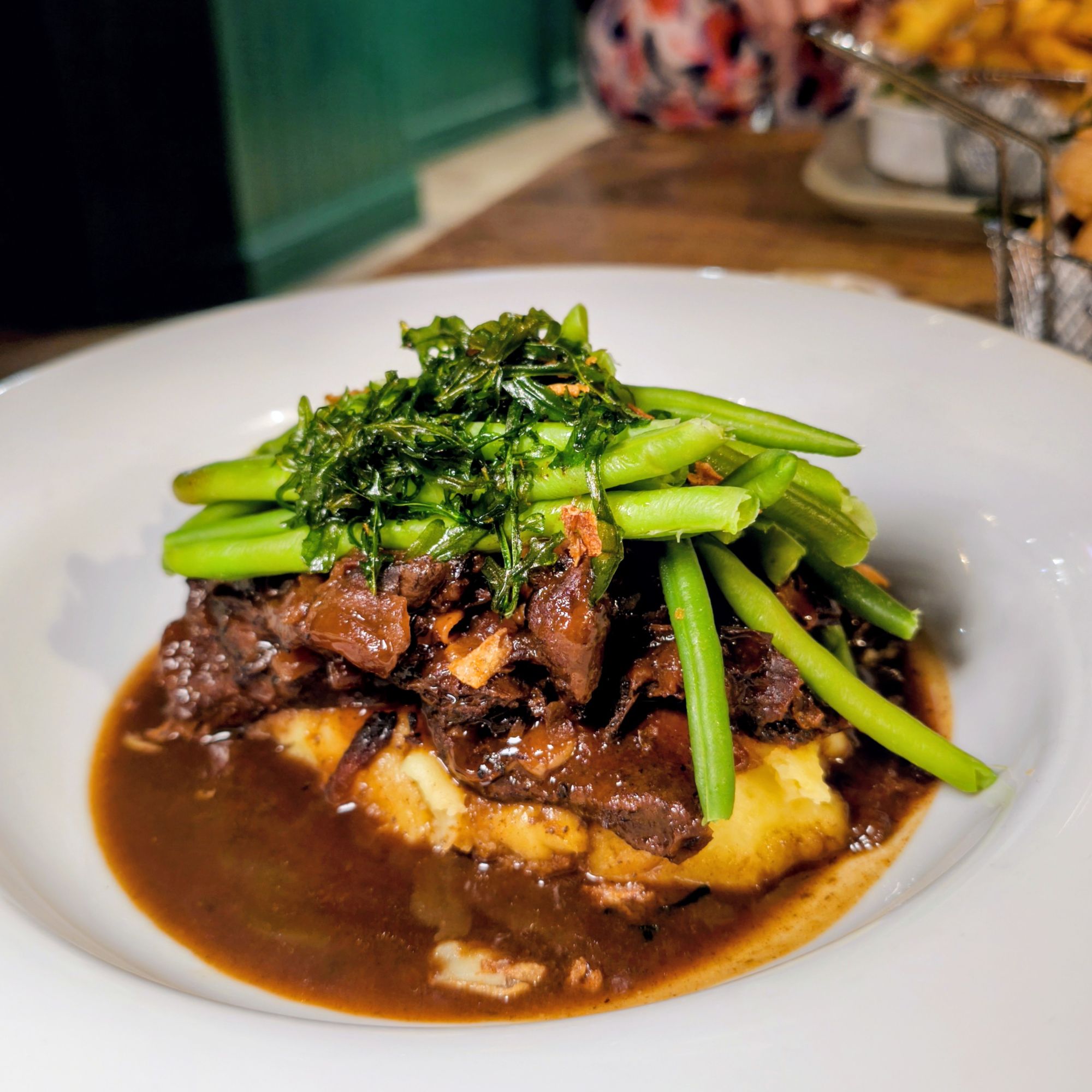 Braised beef cooked for eight hours in a shallot, garlic and date sauce. It comes with creamed potatoes, greens and crispy rocket. £15.50 (from the specials board)