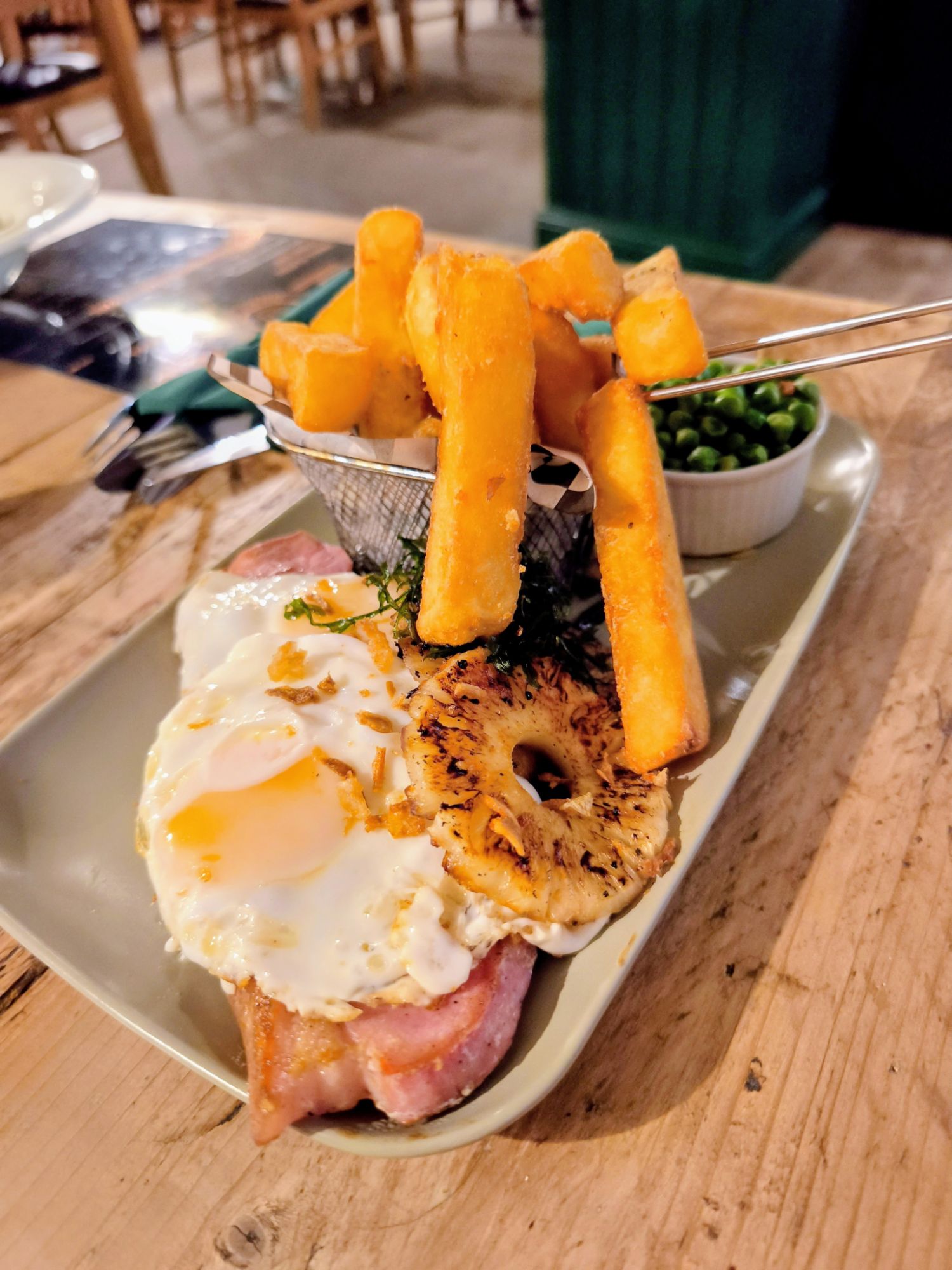 Local Griddled 8oz gammon. It comes with charred pineapple, two fried eggs, twice cooked chips and petit pois. £15.